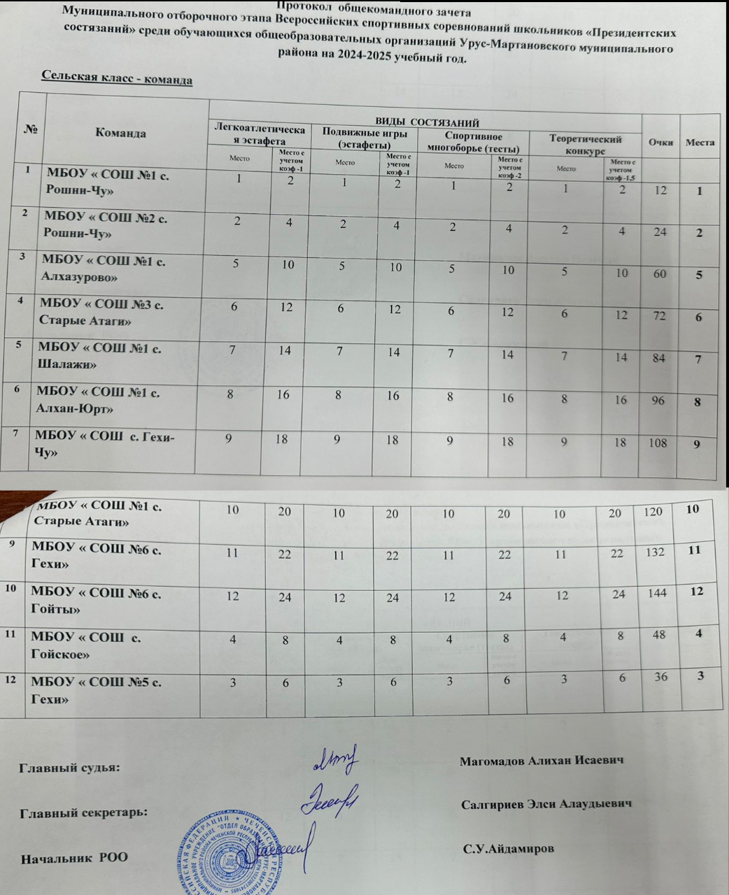 Протокол общекомандного зачета Муниципального отборочного этапа Всероссийских спортивных соревнований школьников "Президентских состязаний" среди обучающихся общеобразовательных организаций Урус-Мартановского района на 2024-205 учебный год.