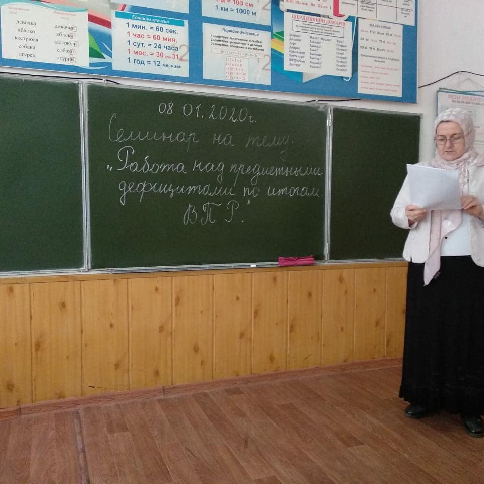 В начальной школе прошел семинар на тему: " Работа над предметными дефицитами по итогам ВПР" Провели: Зам дир по УВР НК Закаева Т.А. и руководитель ШМО Ампукаева М.Х. Выступили учителя Адаева Я.А., Эльбуздукаева Т.А