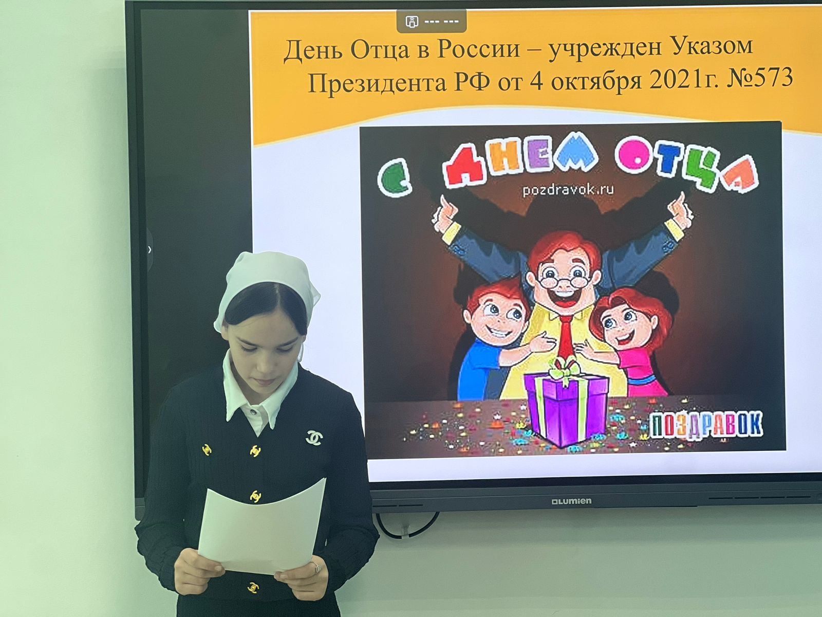 05.12.2024Педагог психолог Сугаипова Карина Магадиевна провела классный час "День отца". Роль воспитательного мероприятия: формирование нравственных качеств личности учащихся по отношению к собственному дому, своей семье, к исторической памяти своего народа. Этому внеклассному мероприятию предшествовали классные часы, на которых дети знакомились с историей возникновения данного праздника, известными выдающимися полководцами, профессиями своих родителей – пап. Мероприятие идет в системе нравственного воспитания.
