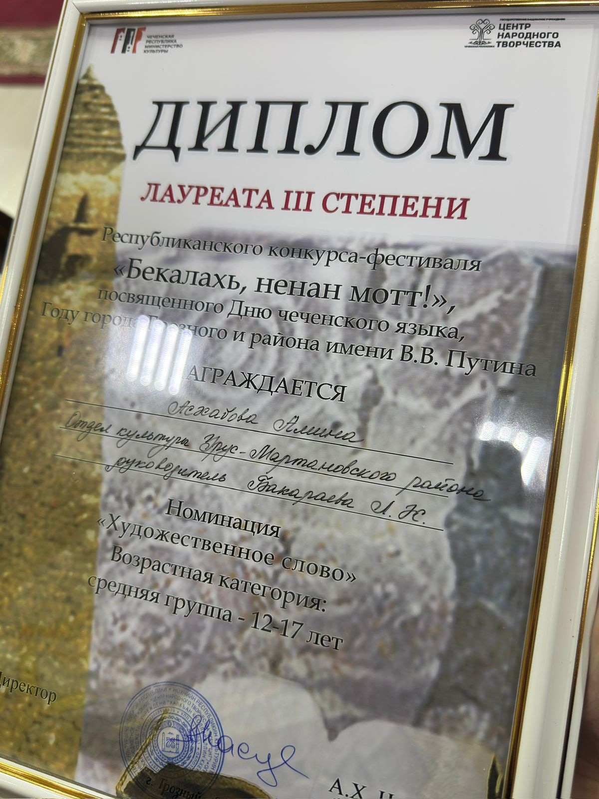 Ученица 9 Б класса нашей школы Асхабова Амина заняла призовое место в Республиканском конкурсе-фестивале "Бекалахь, ненан мотт!".